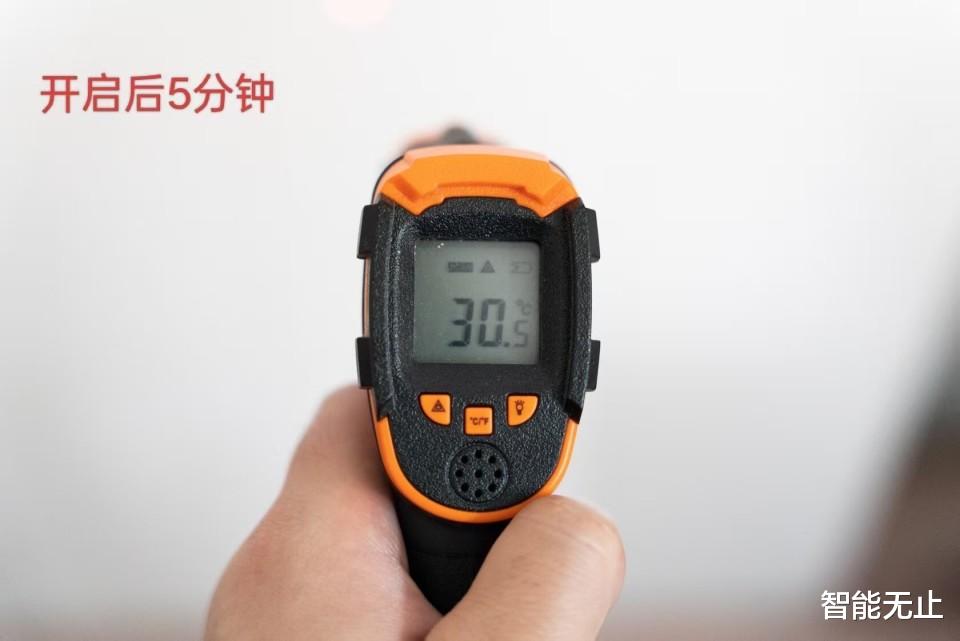 制热是暖风机的核心卖点,宫菱VSS在这方面表现堪称史诗级。这源自于其采用了非常豪华的堆料,就好比主打的石墨烯+PTC双加热技术,开机后的短短几秒内就能感受到暖意,并且在随后的几分钟,我所处的卧室就能达到舒适温度,制热效率杠杠滴。我放置的卧室大小为15平方米,初始温度22.1℃时,开机5分钟旁侧温度直接升至30.5℃,用起来比空调好用多了。