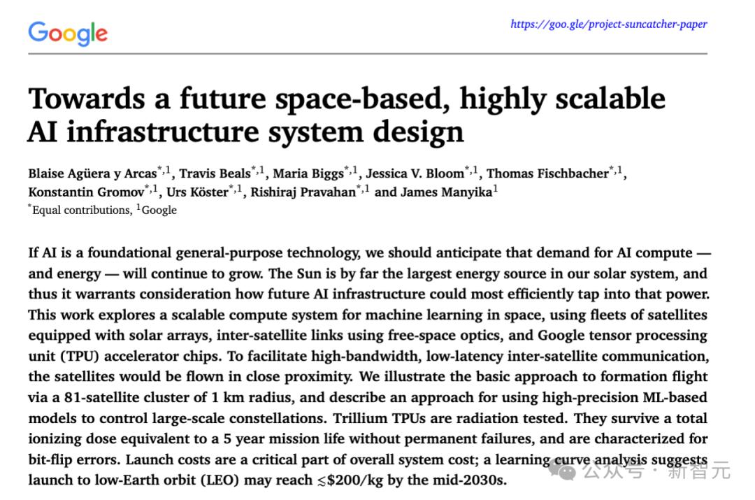 谷歌最新的论文叫做《迈向未来基于太空的、高度可扩展的人工智能基础设施系统设计》。