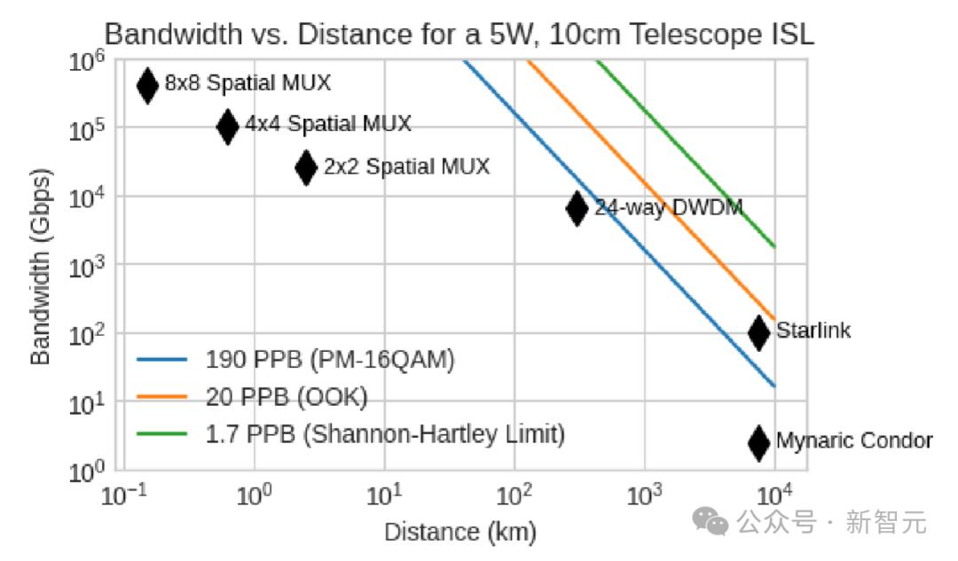 图中X轴(距离,单位:km):表示光学星间链路(OISL)中数据传输的距离,范围从不到1公里到超过10,000公里。Y轴(带宽,单位:Gbps):表示不同光学系统在对应距离下所能实现的带宽。
