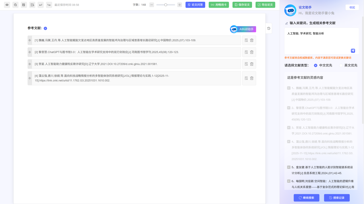 3. 修改阶段:利用雷小兔“格式排版”功能一键适配学校最新要求→通过“降重润色”调整表述(保留原创立意)→逐篇核验参考文献,确保来源可追溯→完善AI使用披露表;