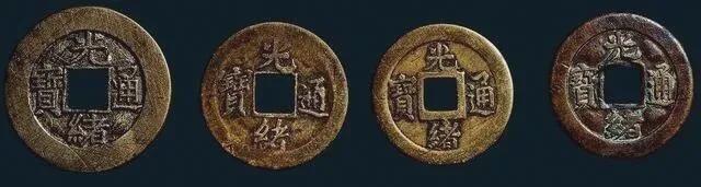 同治十三年,公元1874年,清穆宗去世,慈禧太后迎立自己的胞妹(醇亲王福晋)的儿子入继为帝,改元光绪,先后铸行过“光绪元宝”和“元绪重宝”,“光绪通宝”,通宝制钱铸于公元1875-1908年之间,钱重从开始的一钱逐步减至八分,最后减至六分,该钱书法为楷书,此外宝福局也铸过篆文钱,光绪通宝钱背文为满文记局名,也有星月纹,字有宝河、宝真、宝津、宝云、宝黔等,还有铭“千字文”者(即背穿上各见“千字文”中一字,为宇、宙、日、月、往来等字)。