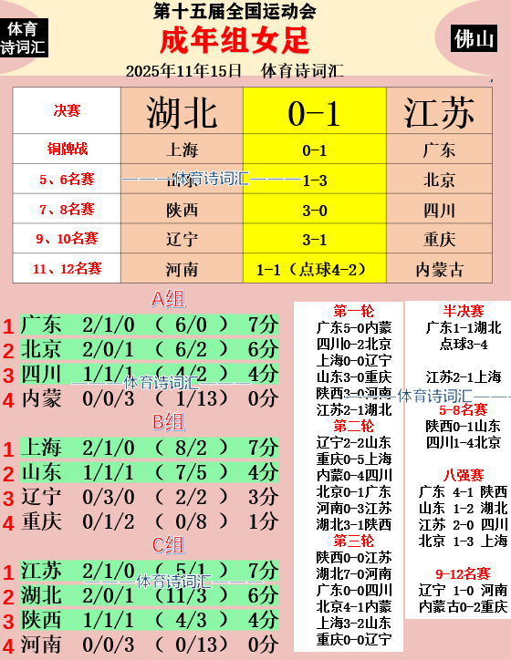 最终,本届全运会成年女足排名出炉:1、江苏(冠军);2、湖北(亚军); 3、广东(季军);4、上海(殿军);5、北京;6、山东;7、陕西;8、四川;9、辽宁;10、重庆;11、河南;12、内蒙古。