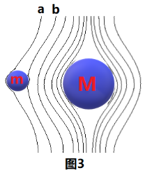 被弯曲的微线有伸直的势能,会对迫使微线伸直的物质产生了向内的压力。当物质经过弯曲的微线时也会受到这种不平衡的压力,这种压力就是我们所感受到的地球引力,如图3。物质M引起周围微线的弯曲,m经过弯曲的微线a、b时,微线a给m的压力大于b给m的压力,因此m就像被M吸住一样滑向M。