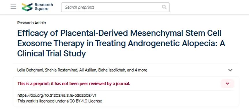 [2]Dehghani, Leila & Rostamirad, Shahla & Asilian, Ali & Izadikhah, Elahe & Abedini, Fatemeh & Shoushtarizadeh, Mohammad & Emami, Mahdi & Soleimani, Masoud. (2024). Efficacy of Placental-Derived Mesenchymal Stem Cell Exosome Therapy in Treating Androgenetic Alopecia: A Clinical Trial Study. 10.21203/rs.3.rs-5252508/v1.
