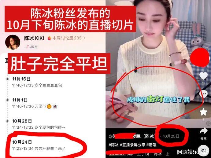 依然有陈牧驰粉丝在洗,说陈冰10月份直播的时候肚子还是平坦的呢: