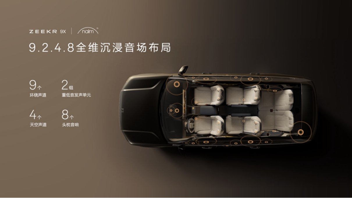 在极致的静谧表现之上,极氪与英国皇室御用音响品牌Naim深度合作,为极氪9X联手打造全球最大功率的车载音响。它拥有3868瓦的峰值功率,32个扬声器,支持杜比全景声,采用9个环绕声道、4个天空声道、8个头枕音响及2个低音炮,让每个座位都能享受殿堂级沉浸音效。