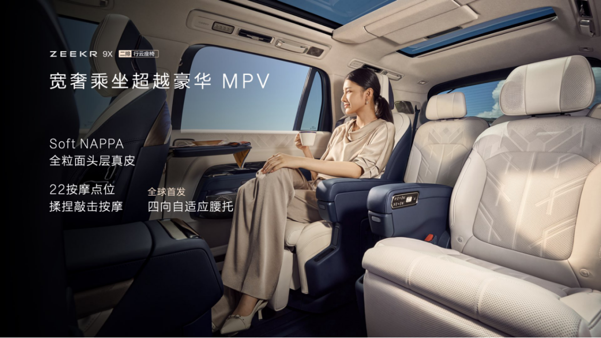 第三排同样不打折。极氪9X采用一体式压铸后端铝车身与强化CD柱结构来保护碰撞安全,能承受时速105公里的追尾与侧碰冲击。第三排还拥有同级最强的乘坐体验,最大135度躺倒角度与同级最大140毫米电动滑移行程,加上专属独立天窗与“坐坐高升”布局,让第三排成为通透明亮的阳光房。