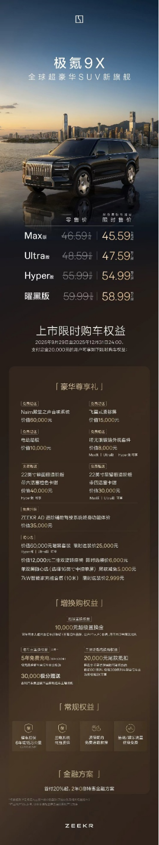 2025年9月29日至2025年12月31日,支付定金20,000元的用户,可享的限时购车权益,包括:免费赠送价值60,000元的Naim殿堂之声音响系统;免费赠送价值15,000元的飞翼式滑移屏;免费赠送价值10,000元的电动踏板;免费赠送价值8,000元的哑光银镀铬外观套件;免费赠送价值40,000元的22英寸镜面锻造轮毂带六活塞橙色卡钳(Hyper版可享);免费赠送价值30,000元的22英寸星耀锻造轮毂带四活塞卡钳(Max版和Ultra版可享);免费升级价值35,000元的ZEEKR AD进阶辅助驾驶系统终身功能体验;价值60,000元的曜黑套装,限时选装价25,000元(Hyper版和Ultra版可享);价值12.000元的二排双旋转座椅,限时选装价6,000元;单双屏随心选(如选择16英寸中控单屏尾款可减免5,000元);7kW智能家充桩套餐(10米)限时选装价2,999元。同时,还提供10,000元超级置换金,用户可使用本人或亲友旧车行驶证(不限旧车品牌、公户/个人户)申请,用于订单尾款减免;极氪品牌新车首任车主增换购极氪9X,可享五年免费充电权益(每年1,000度),或吉利汽车集团旗下品牌现任车主增换购极氪9X,赠送30,000极分;搭载非千里浩瀚辅助驾驶系统的极氪001系列、极氪009系列车型首任车主,购买极氪9X可享20,000元尾款抵扣。