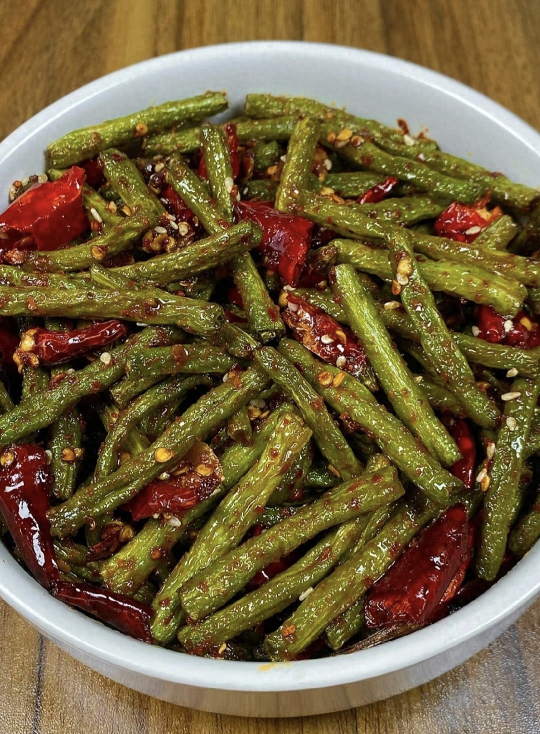 朋友们,我真的必须和你们分享这道让我欲罢不能的家常菜——干煸豆角!那天端上桌,还没等拍照,筷子就停不下来,直接炫完一整盘!炸过的豆角边缘微焦,咬开居然带着一丝若有若无的甜,混合着花椒的麻、干辣椒的香,还有肉末的酥……救命,这味道真的泰好吃啦!