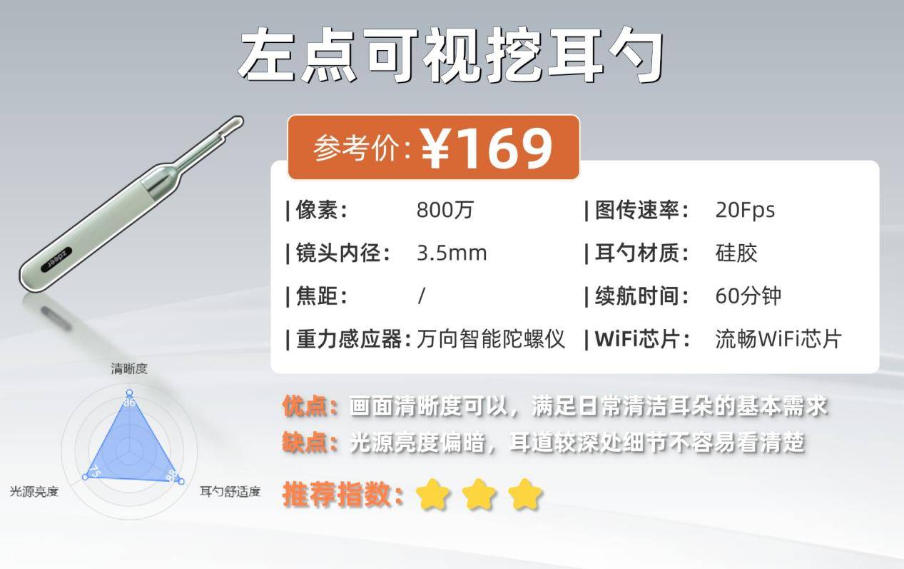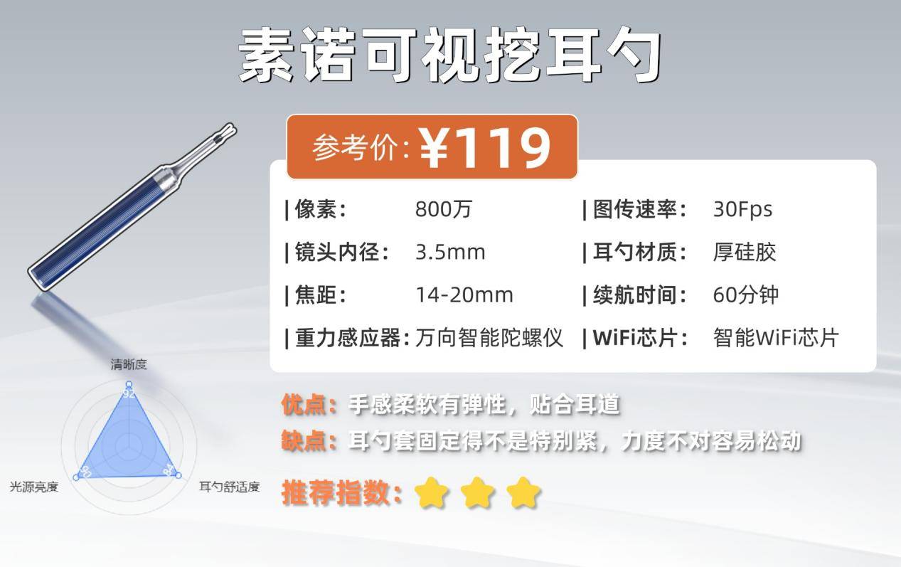 善尼体属于入门级可视挖耳勺,基础功能都齐全,适合日常家用,但在画质和光源表现上还有提升空间。