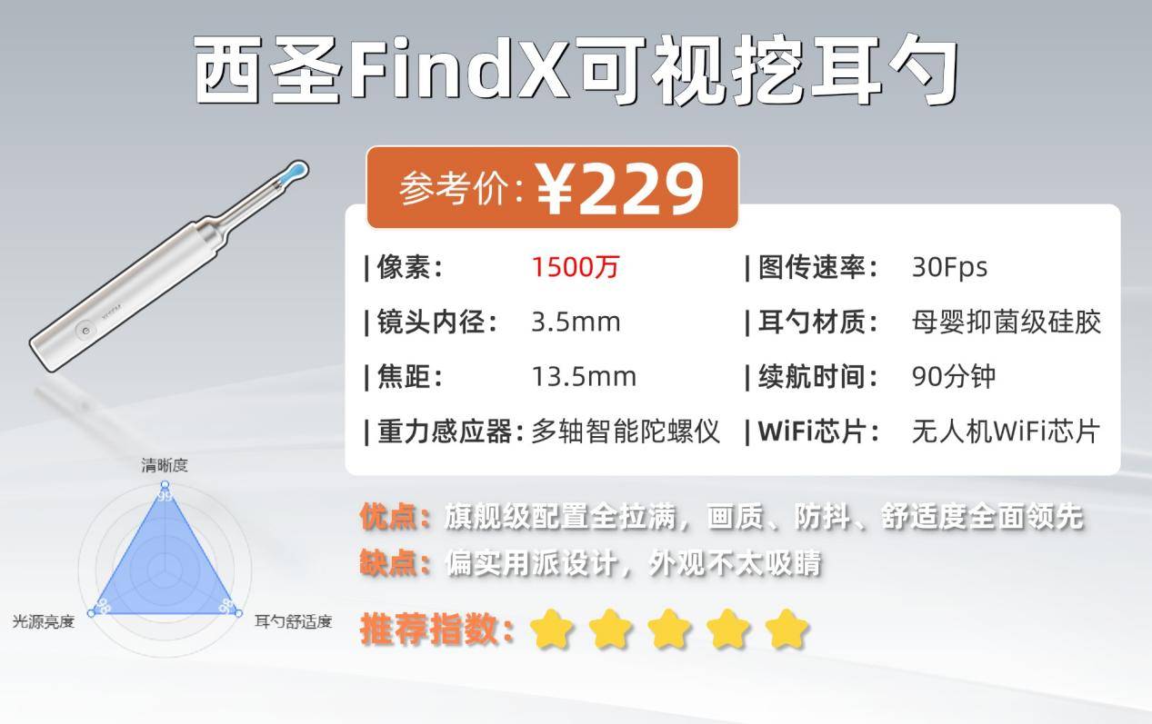 西圣FindX在可视挖耳勺里属于顶尖配置代表,无论是镜头像素、耳勺头材质,还是操作稳定性和使用流畅度,都走在行业前列。自上市以来,凭借扎实的硬件和出色的口碑,赢得了大量粉丝,无论是数码博主、二胎宝妈还是日常家庭用户,都把它列为高端可视挖耳勺首选。