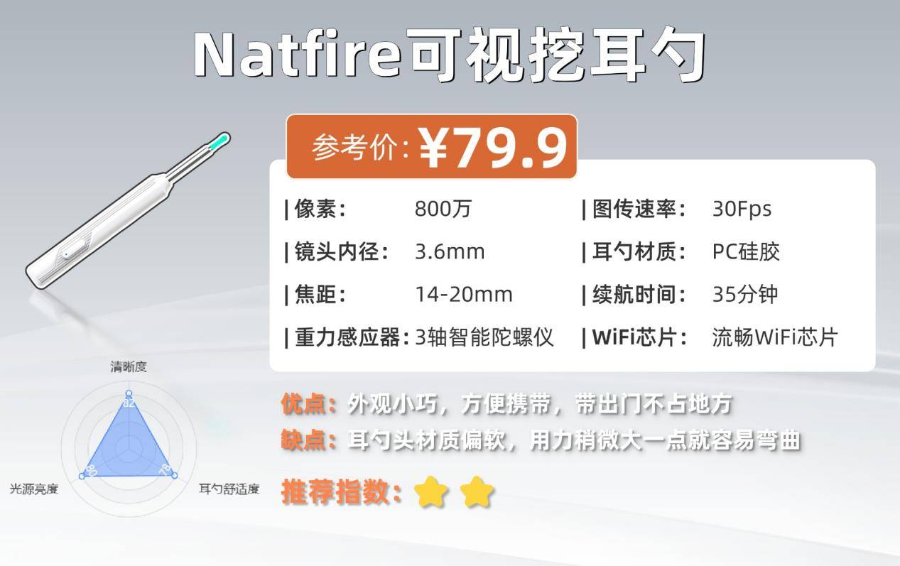 Natfire定位偏基础型,适合日常清洁使用,但在画质和操作稳定性上稍显妥协,不适合追求高精度掏耳的人群。