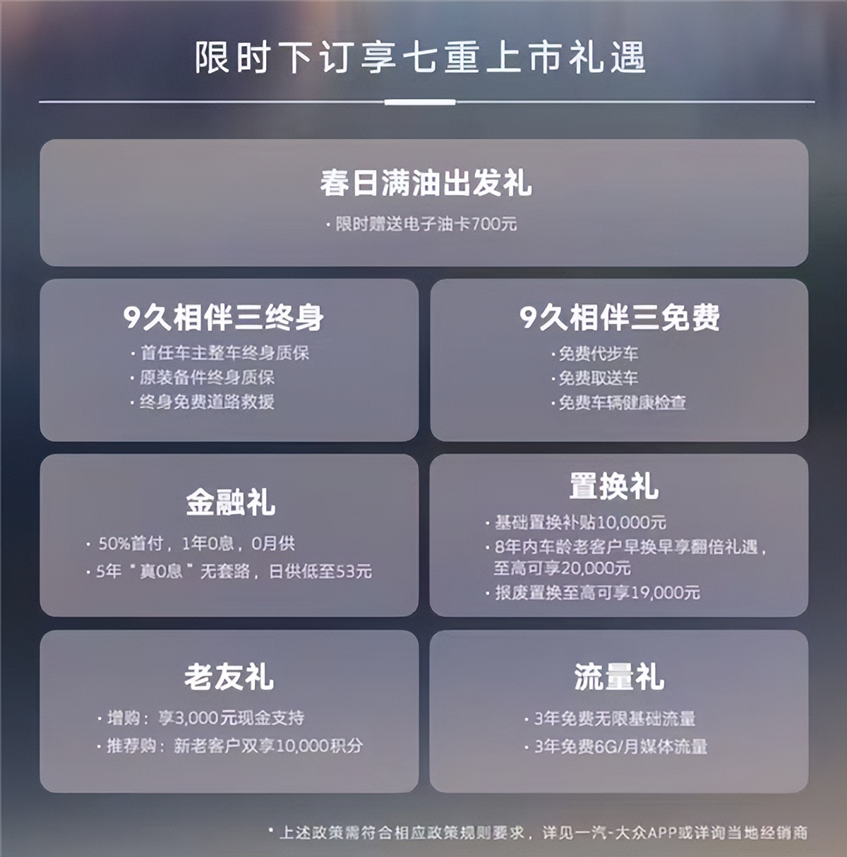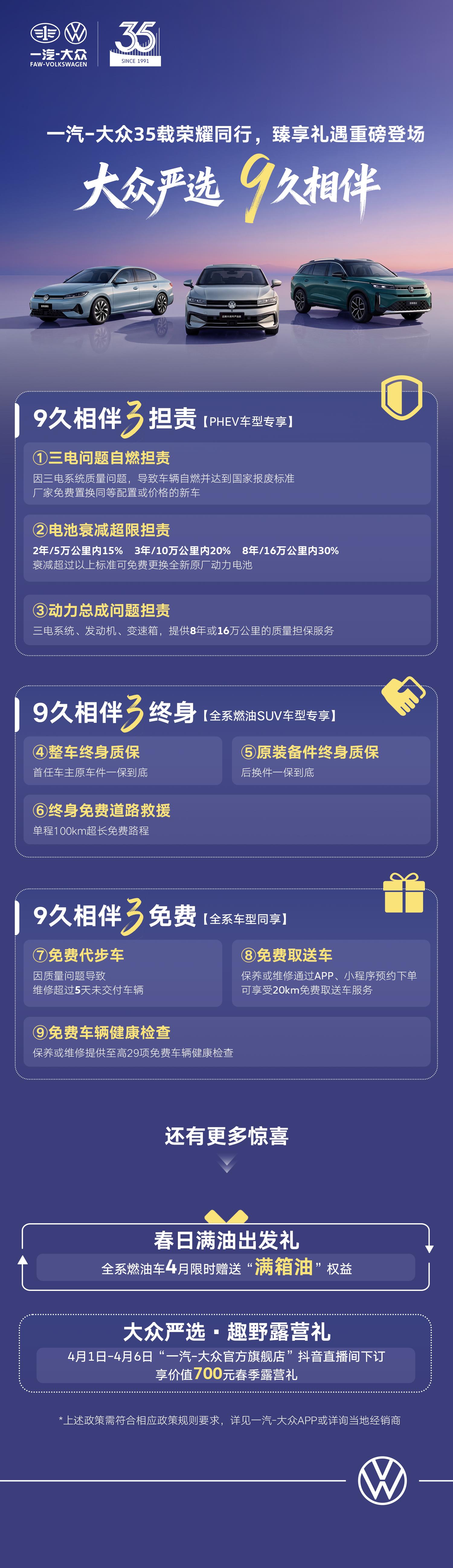 3月31日下午,一汽-大众在春季新品发布会上抛出了一枚重磅炸弹——正式发布“大众严选9久相伴”服务体系,同时带来全新揽巡和全新速腾S两款车型。自燃直接赔新车、整车终身质保、免费代步车……这份覆盖新能源与燃油车型的服务清单,几乎把行业惯例重新写了一遍。