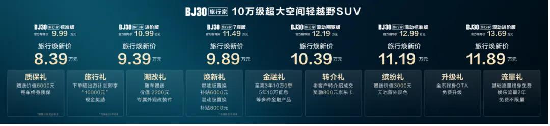 2025年9月27日世界旅游日,北京雁栖湖畔,北京越野BJ30旅行家正式发布。这款定位“10万级超大空间轻越野SUV“的新车共推出6款车型,官方指导价9.99-13.69万元,旅行焕新价仅8.39万元起(叠加国补和厂端置换后)。同时推出包括整车终身质保在内的九重礼遇,总价值高达4.3万元。