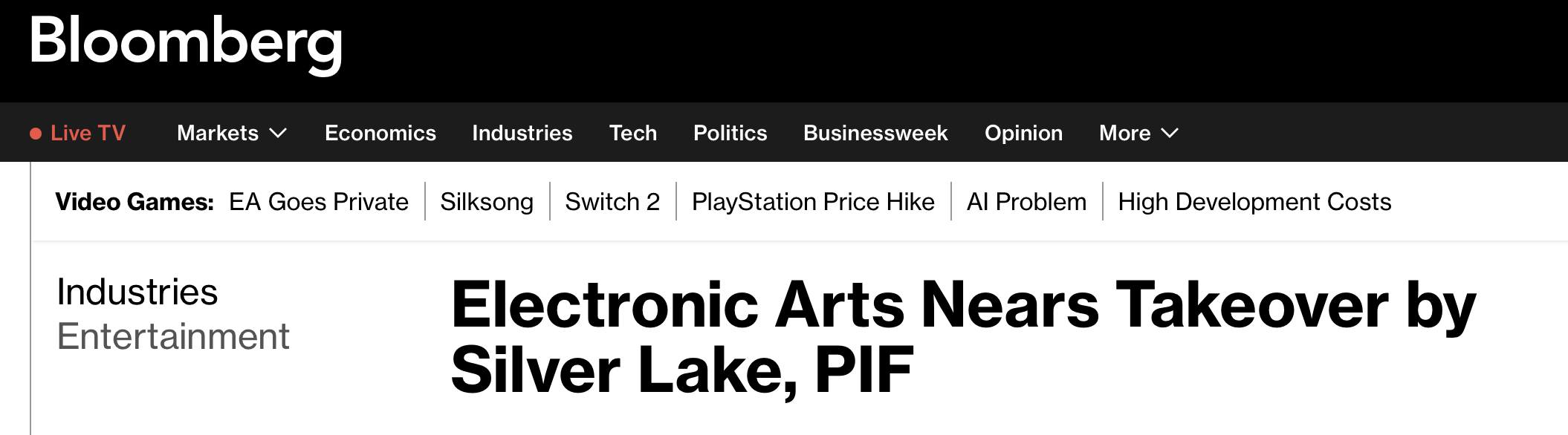 电子艺术(EA)以550亿美元,被沙特主权财富基金(PIF)、银湖资本以及AffinityPartners联合收购,这一行为刷新了杠杆收购纪录。这笔交易,不单是资本的运作,更是AI时代下,游戏产业与主权资本深度交融的标志,预示着“主权基金+私募科技IP”这样的新型产业整合模型正在逐步形成。