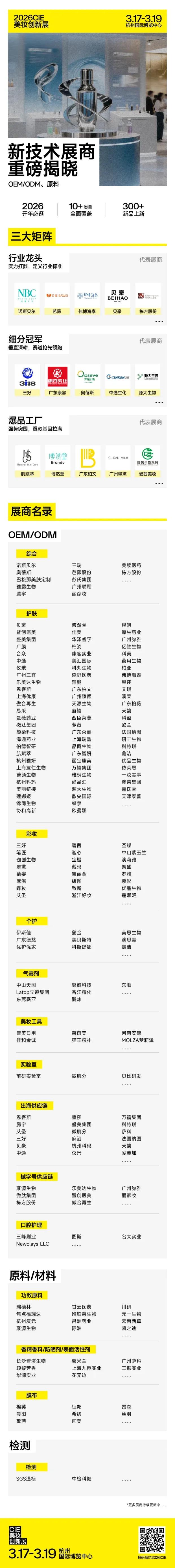 OEM/ODM、创新原料代表展商:诺斯贝尔、伟博海泰、芭薇股份、贝豪集团、栋方股份、伊斯佳股份、Latop立道集团、天图精化、合众集团、上海仪玳、乐美达生物、上海麻沼、恩客斯、腾宇集团、三好科技、晟薇药业、焦点福瑞达…
