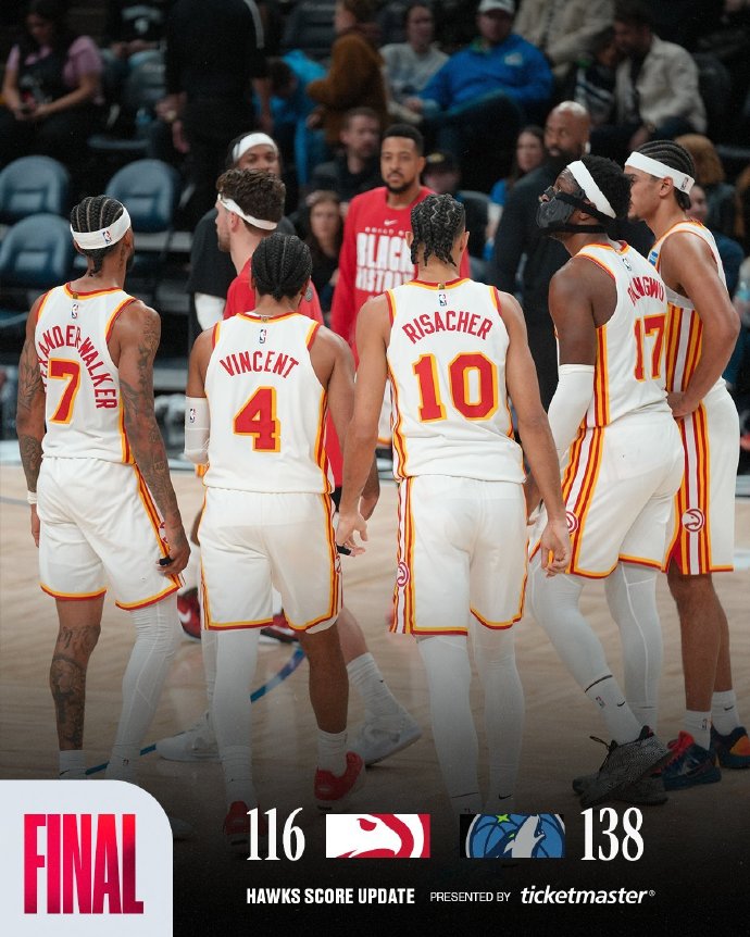 老鹰这边,杰伦-约翰逊今天缺阵,麦科勒姆迎来大爆发,打出加盟老鹰后的最佳表现,首发出场33分钟,25投12中,三分9中5,罚球11中9,空砍38分2助攻4抢断,出场3次失误,正负值-25。