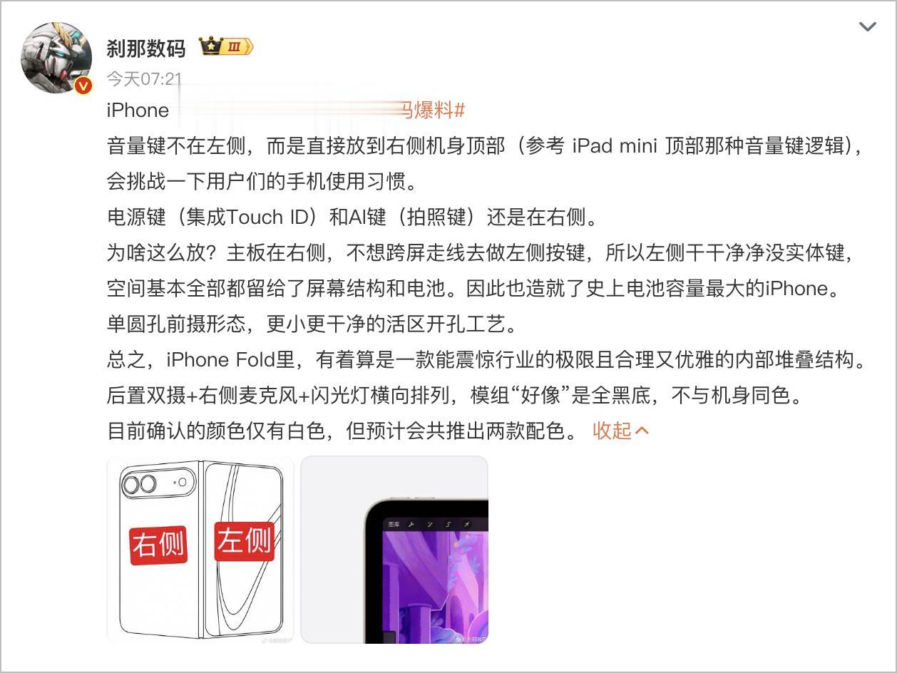 苹果之所以这样调整,可能是出于内部结构的取舍。爆料称,iPhone Fold 的主板集中布置在右侧机身,如果左侧继续设置实体按键,就需要跨屏走线,不仅复杂,还会占用宝贵空间。索性将左侧完全留给屏幕结构和电池模组,让内部堆叠更加高效。