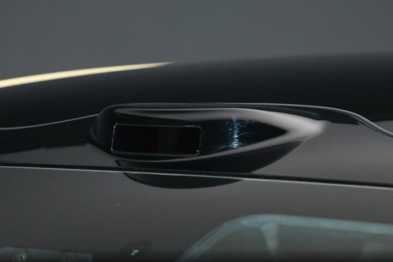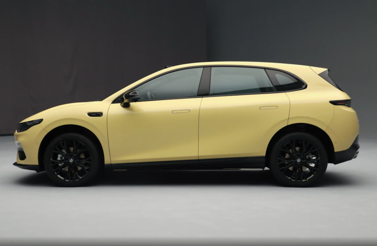 而来到车侧,零跑Lafa5作为两厢车,整体看上去显得更加紧凑,配合上实车用到的19英寸熏黑轮毂,以及轮拱区域的宽体造型,也能提升整车的力量感。而除此之外,零跑Lafa5居然还配备了无框车门,更进一步的强调了新车的运动感和档次感,同时也有几分“小钢炮”的既视感。