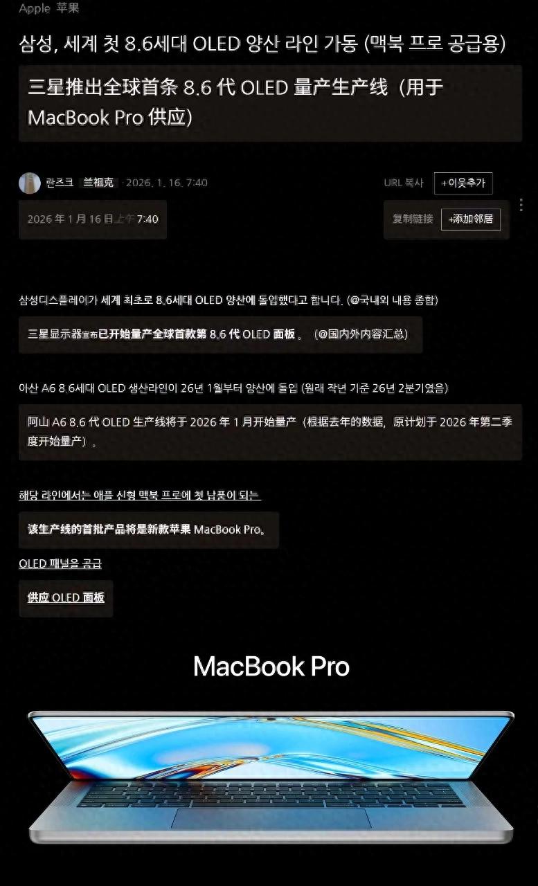 近日,据韩国消息源yeux1122报道,M6 MacBook Pro的OLED显示面板将于本月26日开启量产,由三星显示供应。