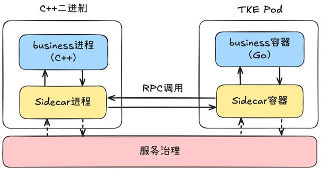 随着微信读书的发展,越来越多异构的系统发展起来,例如推荐算法系统是独立部署在TKE上的容器服务,采用GO语言开发,好处是历史负担少,运维更加方便、开发更加便捷。两套系统同时存在带来的问题是如何做好服务治理,推荐系统需要频繁调用后台基础模块获取用户数据,必须要有一套完善的路由管理、容灾机制,且考虑到是异构服务,开发语言也不相同,如果为每种语言都定制开发一套服务治理框架,代价会非常高。在这个阶段,我们开发了WRMesh框架,采用Sidecar+Business的方式解决这个问题。