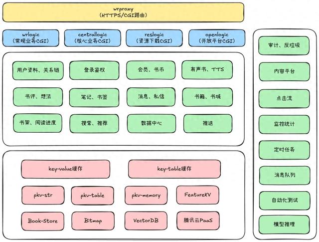 02整体架构微信读书是独立于微信的App,且由于历史原因,开发及运维环境均存在一定的差异与隔离。因此,微信读书的后台服务实现了从接入层到存储层的一整套完整架构。