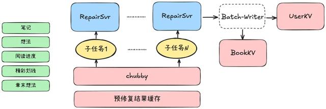 针对上面的问题,我们重新设计了修复服务,目标是最大限度缩短修复时间,并且让整个过程是可靠的。为此,我们先首手考虑业务流程,我们发现在书籍上架前,运营同学本来就需要依赖UGC的修复情况做前置判断是否覆盖上架,这个过程中虽然是对UGC抽样评估,如果能对这个修复映射结果进行缓存,在正式替换文件后,也能一定程度提升修复速度。在核心修复流程中,我们进行了较大的重构,把单本书的修复任务拆解成多个子任务,存储在Chubby上,多机器抢锁共同消费这些任务,由于任务有落盘,在服务上线重启过程中,也能马上恢复。修复过程涉及大量的KV写入,并发太高时容易命中单key的限频或者版本冲突,我们为此开发了针对K-Str和K-Table的写入中间件,可以在内存中聚合一批请求进行批量合并写入,缓解KV层面的失败。