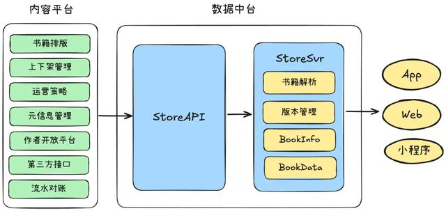 回到最初的目标,我们希望把更多的书籍管理能力开放出来,对上层屏蔽电子书底层的后台逻辑,让运营同学可以更专注于书籍的管理。因此,我们构建了如下书籍数据中台: