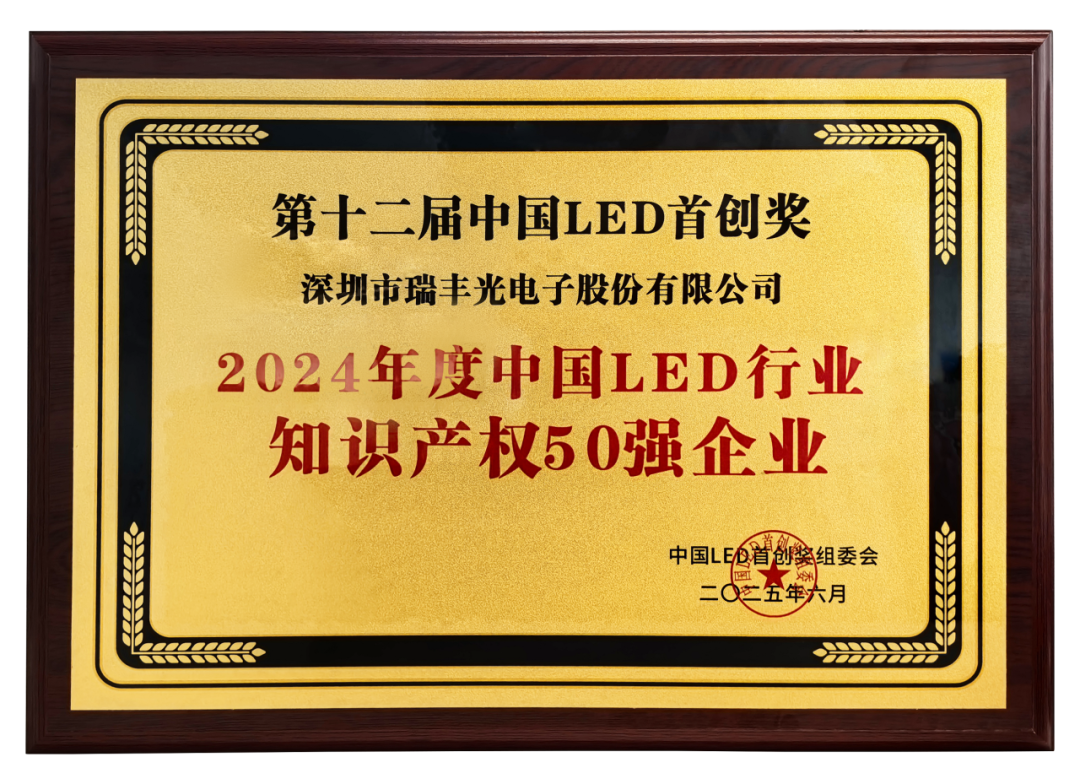 除了在标准建设上成果显著,瑞丰光电还一举斩获“2024年度中国LED行业营收50强”、“2024年度中国LED行业知识产权50强”两项殊荣。
