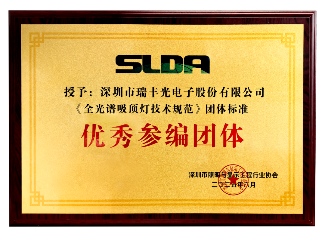 作为核心参编单位,瑞丰光电深度参与《全光谱吸顶灯技术规范》制定,成功入选团体表彰优秀参编单位。