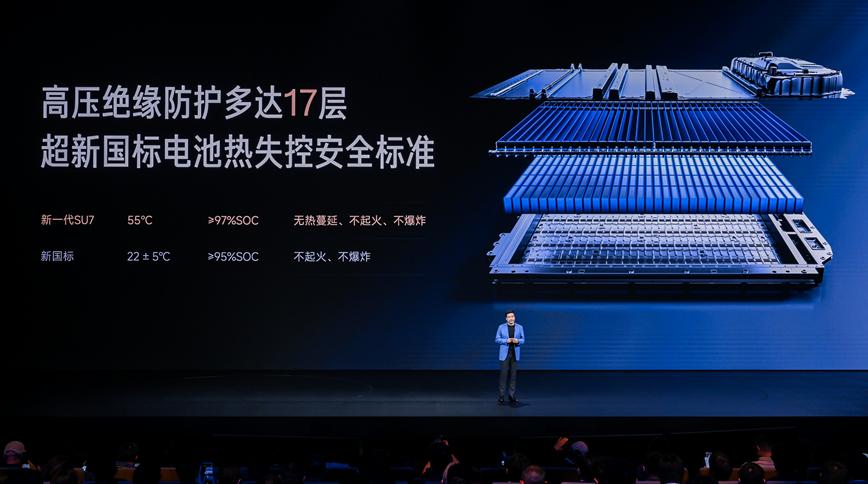 在电池安全上,新一代SU7电池包拥有17层高压绝缘防护、1230多项严苛验证,并且升级了1500MPa防刮底横梁和底部防弹涂层,可以做到行业最高的电池热失控安全标准。