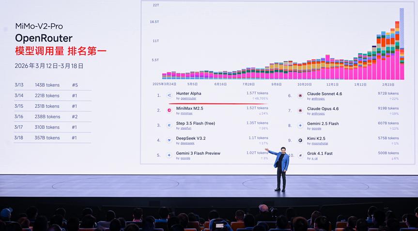 3月19号凌晨,小米对外官宣,Xiaomi MiMo-V2-Pro早期测试版本,正是此前在全球API平台OpenRouter上引发热议的匿名模型“Hunter Alpha”,模型上线后备受全球开发者欢迎,连续拿下多个日榜排名第一,当前位列周榜第一。