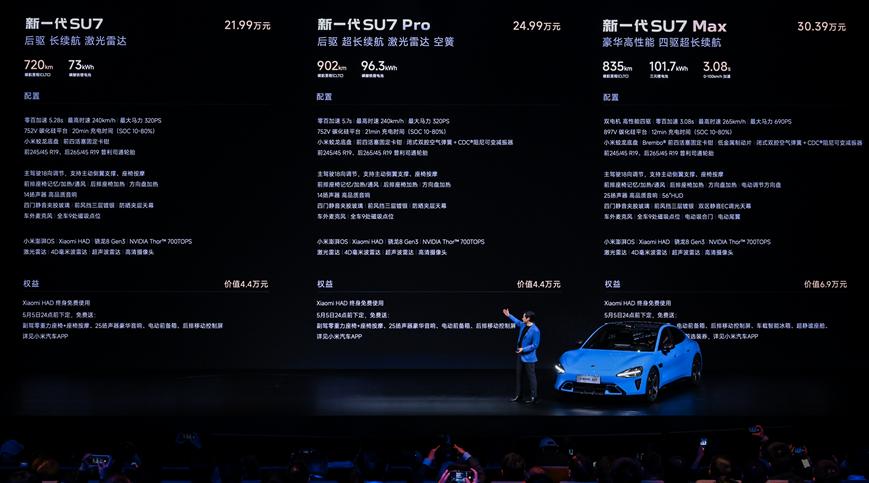 新一代SU7现已正式上市,其中新SU7标准版定价21.99万元起,新SU7 Pro定价24.99万元起,新SU7 Max定价30.39万元起,并支持车漆、轮毂、内饰及多项个性化选配。新SU7还准备了丰富的首销权益:标准版和Pro版首销期锁单,免费送电动前备箱、25扬声器音响、后排移动控制屏、副驾零重力座椅及10点式按摩、Xiaomi HAD等价值4.4万元权益;Max版首销期锁单,免费送电动前备箱、后排移动控制屏、副驾零重力座椅及10点式按摩、车载智能冰箱、超静谧座舱、碳纤维套件、轮毂选装券、Xiaomi HAD等价值6.9万元首销权益。以上权益持续至5月5日24点。