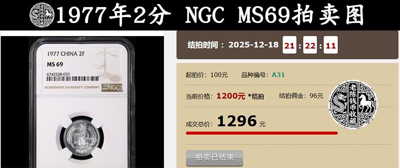 先看看第一枚,一枚1977年的2分硬币,在今年12月18号,拍出了1296元,算一算,和2分的面值相比,足足涨了64800倍。