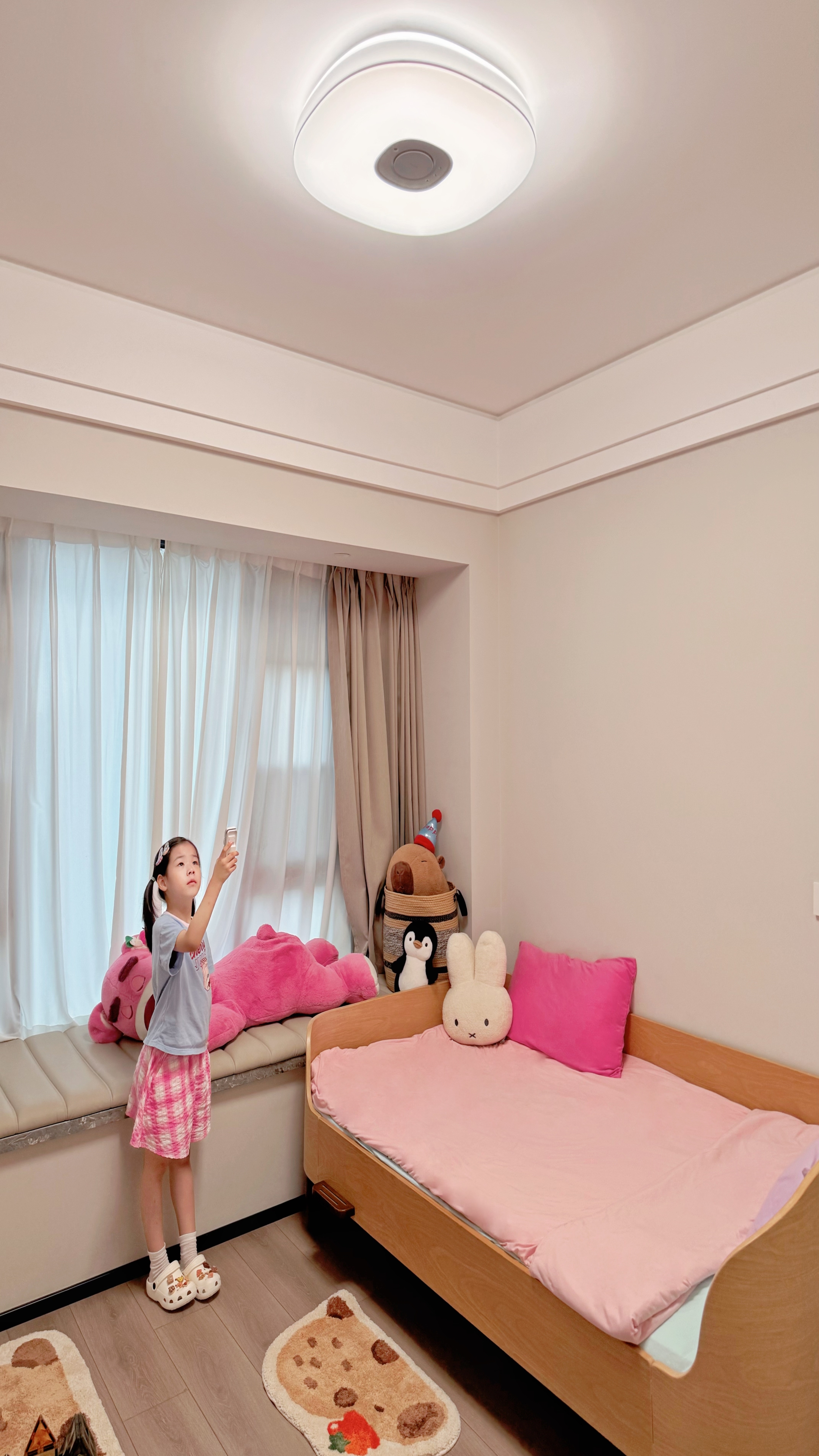 同时,Aora在 25㎡空间内全域照度达到300lx,中心照度高达820lx,实现 全屋0暗角设计。这意味着:无论孩子的房间是10㎡的小卧室还是20多㎡的大空间,无论书桌放在角落、床铺在窗边、地毯在房间中央,孩子在任何位置活动(阅读、拼乐高、做手工、甚至翻跟头)都能获得充足、均匀、无眩光的照明。这种性能是独立于风格的——不管房间刷成粉色还是蓝色,光线质量都一样优秀。