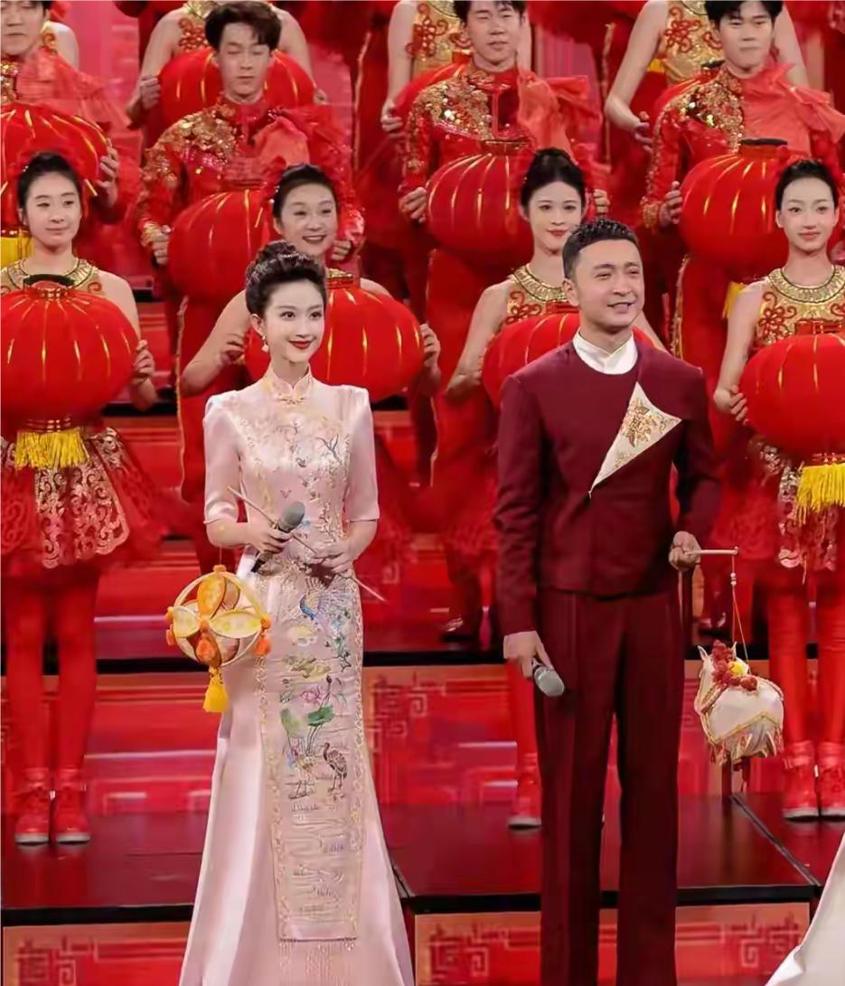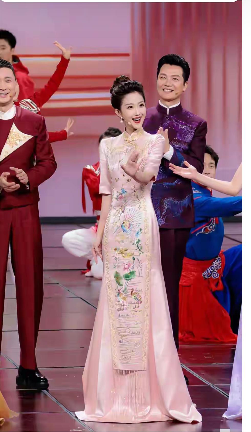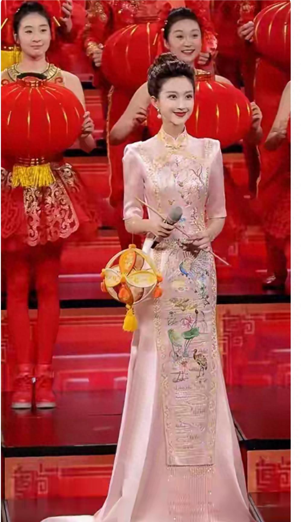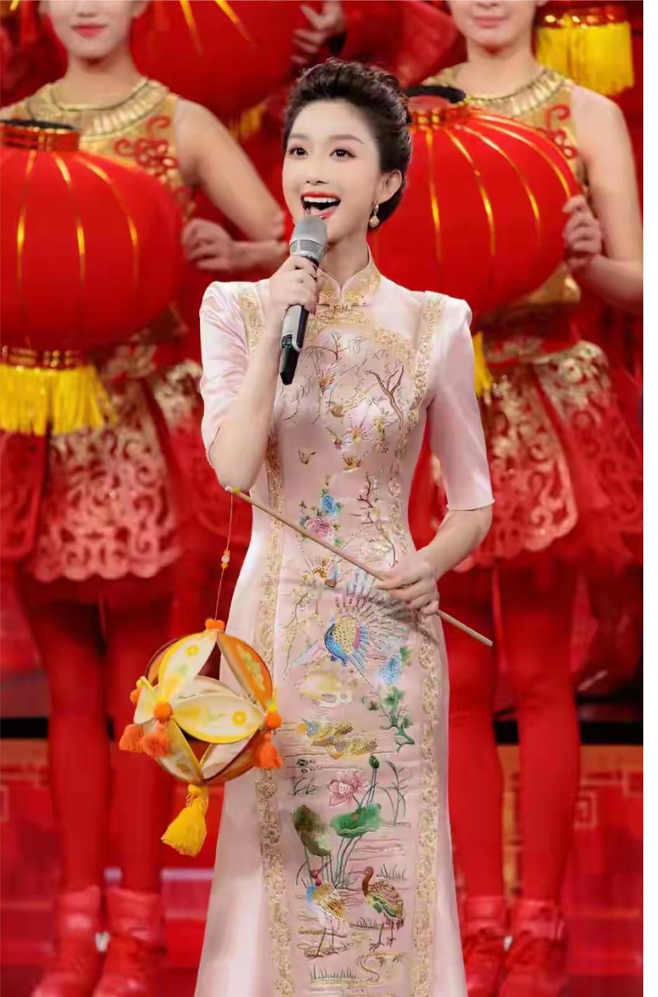 刘心悦一身粉色旗袍惊艳亮相元宵会上,好有气质,优雅。