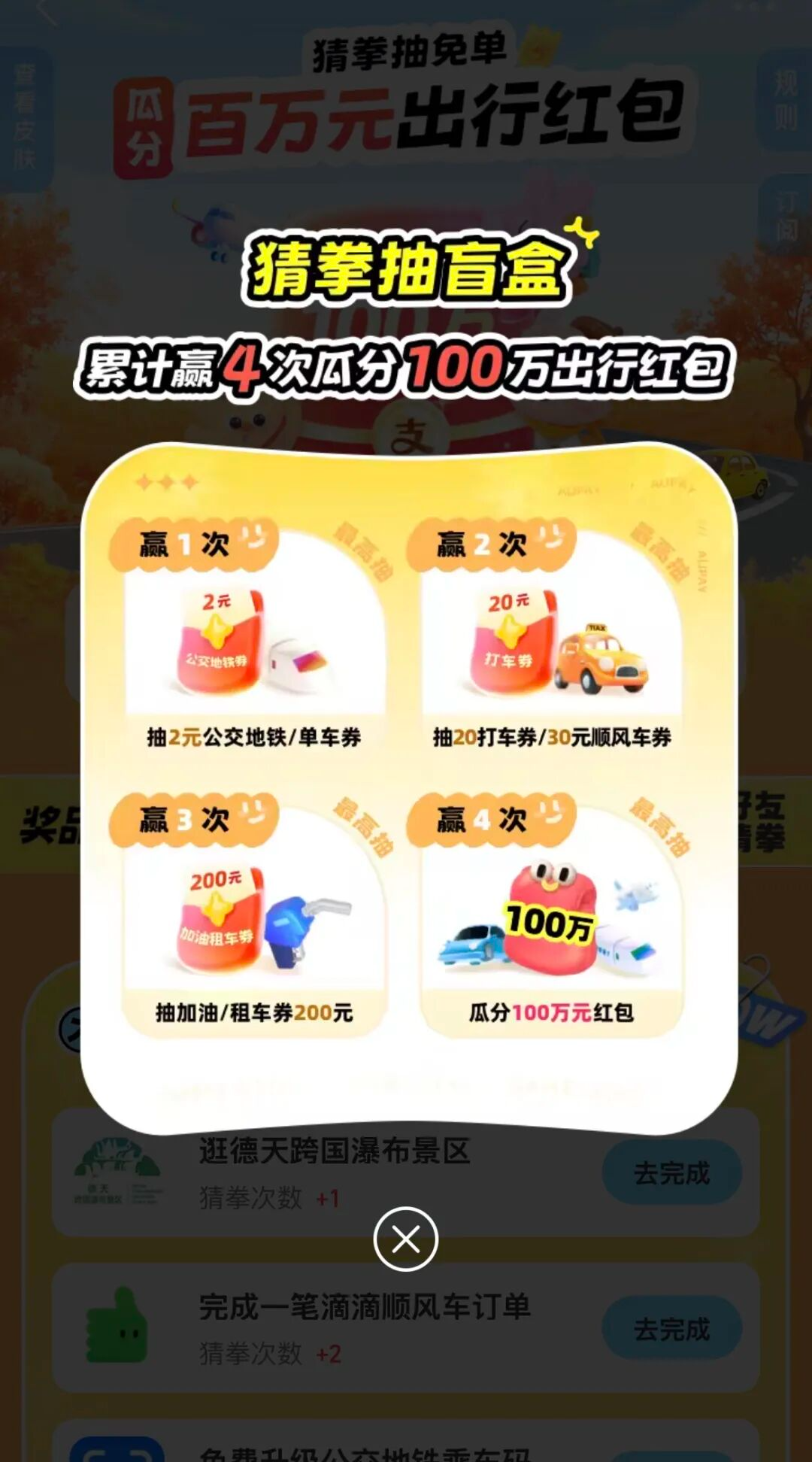 赢2次有机会抽到20元打车免单券或30元顺风车券,接着再用支付宝打车,再也不用纠结「打车贵不贵」了!