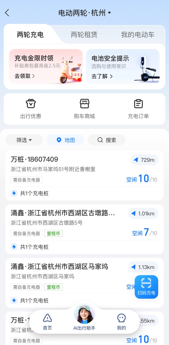 打开支付宝扫充电桩上二维码,或解锁手机碰充电插口的防雨罩,就能进入充电小程序开始充电。