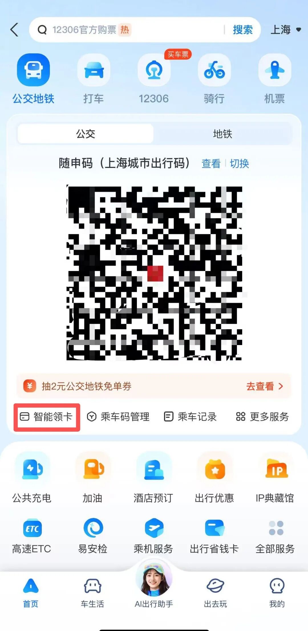 打开「支付宝App-出行-公交/地铁-更多服务/智能领卡-智能领卡」,即可免费开通智能领卡服务。
