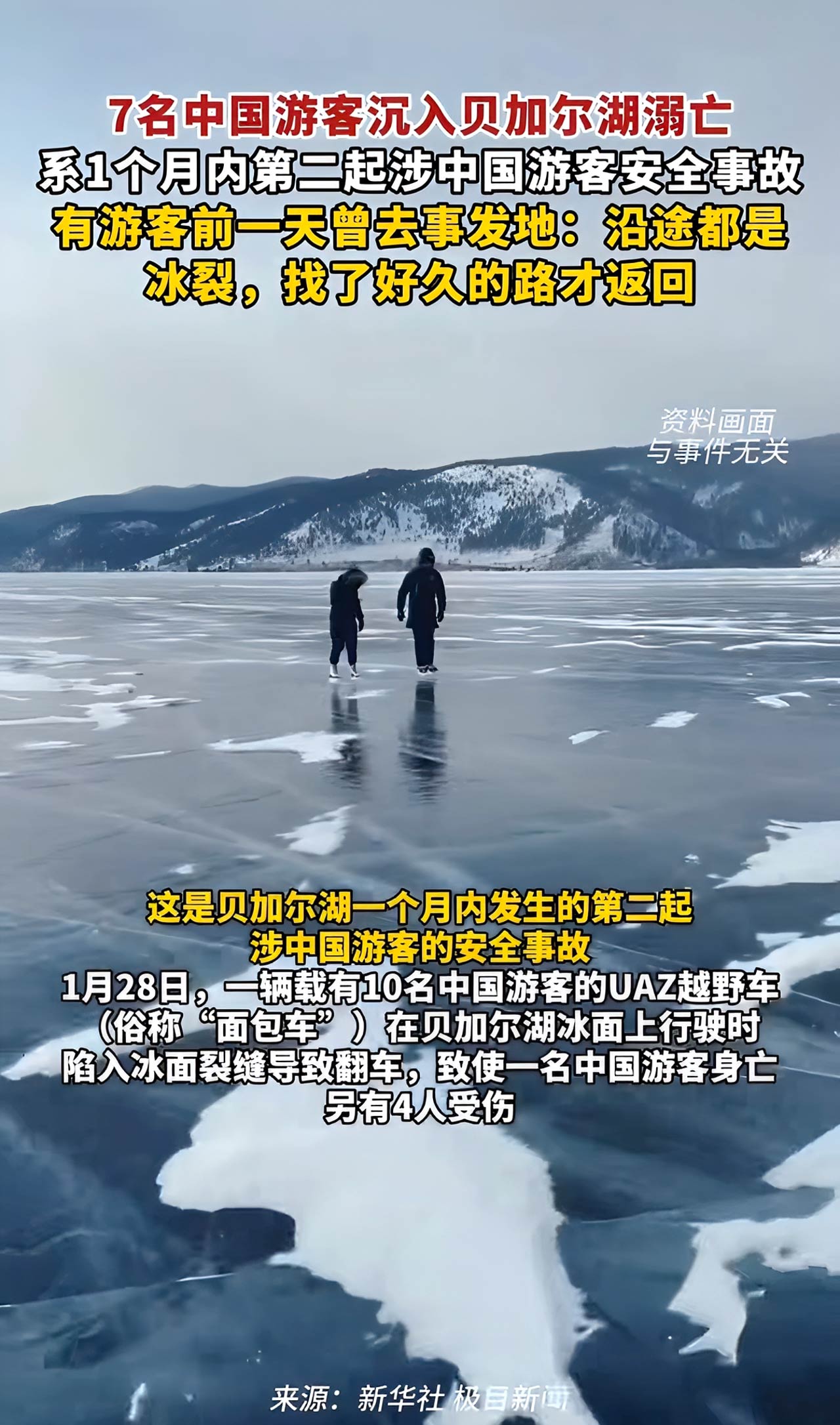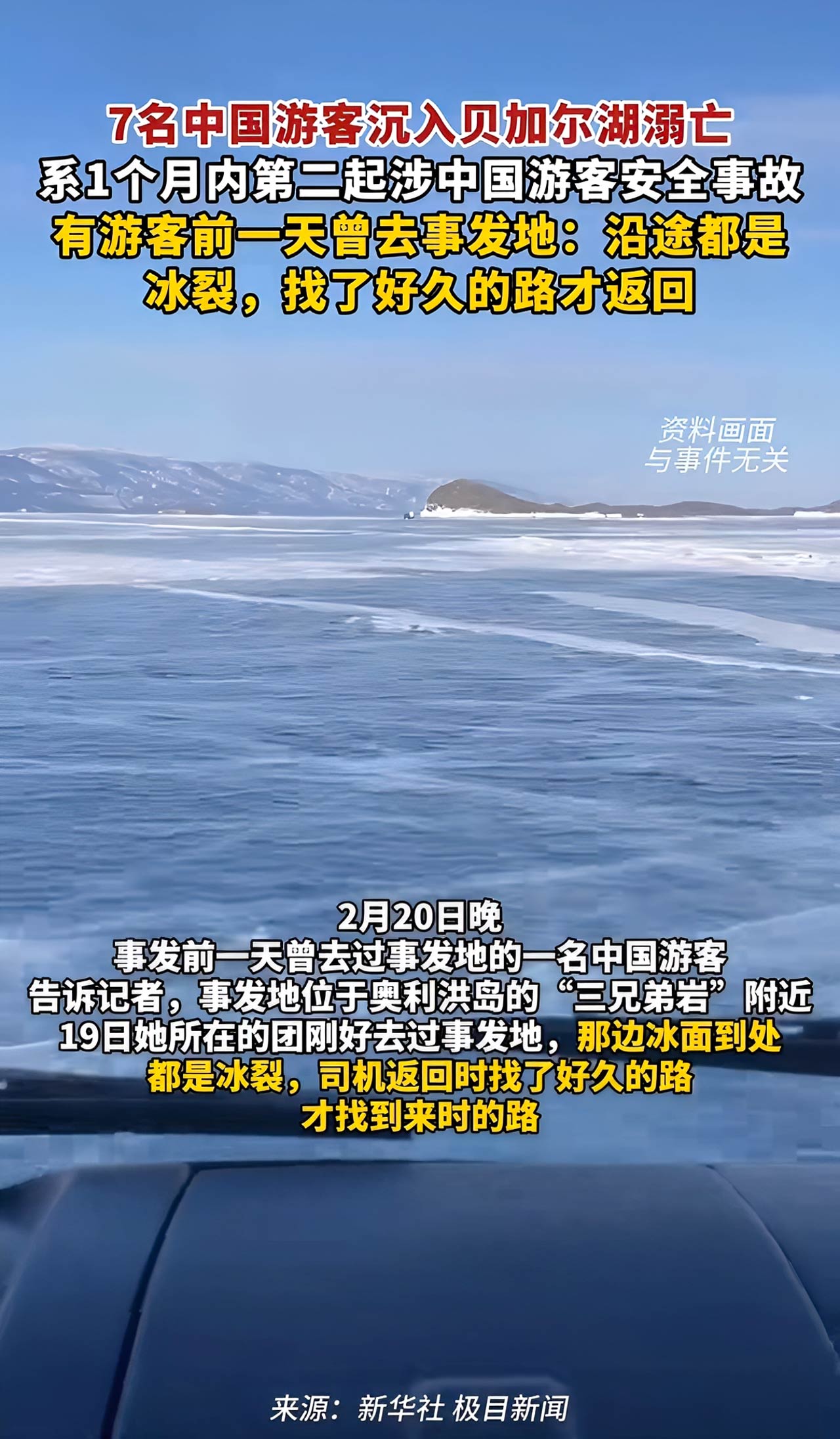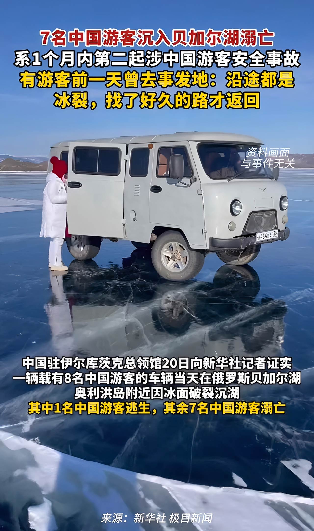 2026年2月20日,俄罗斯贝加尔湖奥利洪岛附近,一场本可避免的悲剧夺走了七名中国游客的生命。一辆载有8名中国游客和1名俄罗斯司机的车辆,在穿越冰面时因冰层破裂沉入湖中,仅1人逃生。经证实,遇难者均为中国公民。