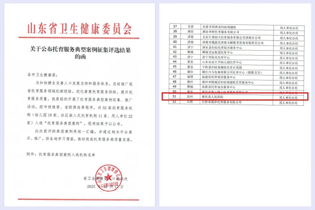 近日,山东省卫生健康委员会公布托育服务典型案例征集评选结果,惠民县在用人单位办托育方面取得新成果,惠民县人民医院入选省级托育服务典型案例。省级托育服务典型案例