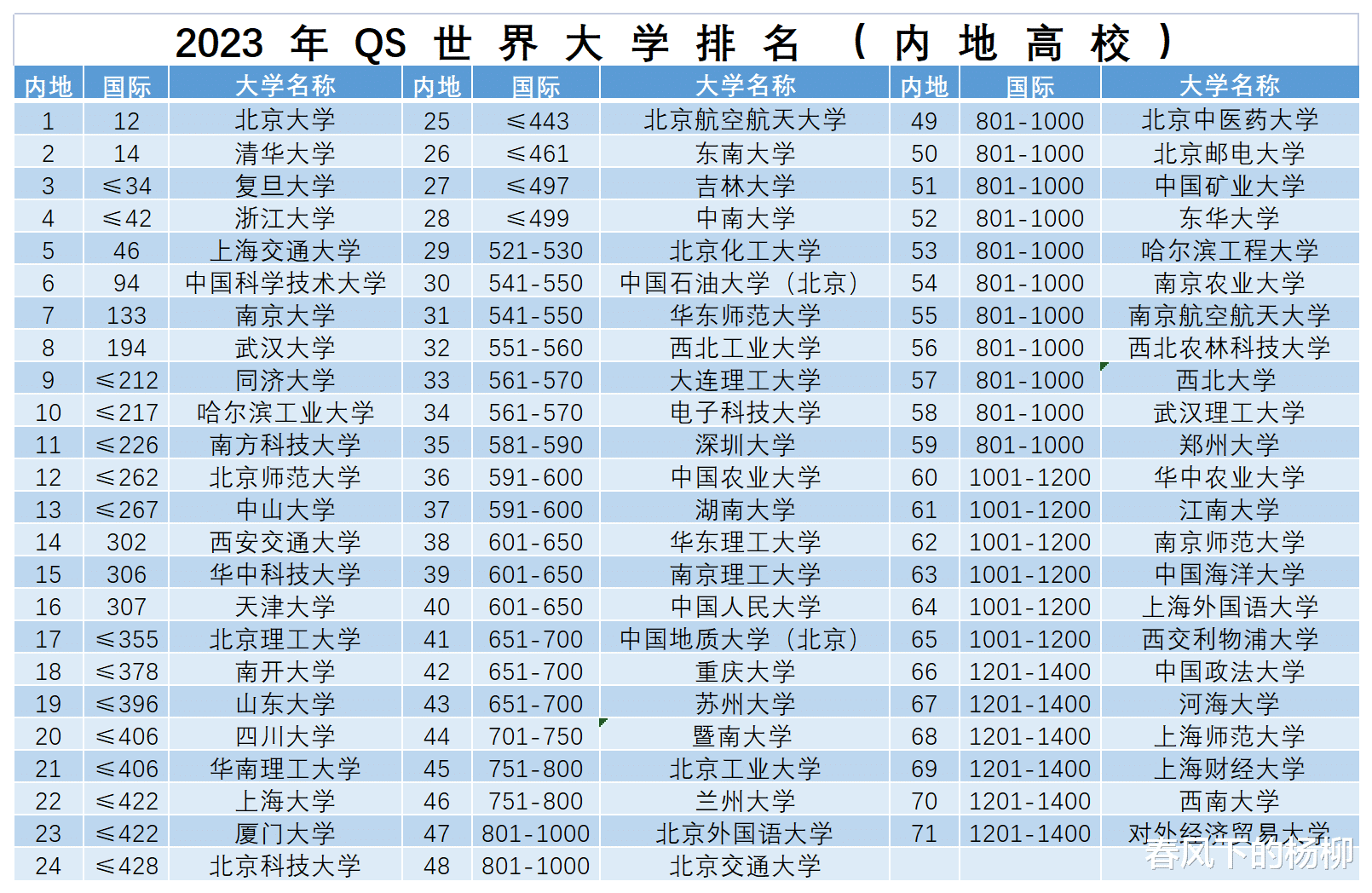 下图是2023年QS世界大学排名中,内地高校的排名情况。你觉得这个排名靠谱吗?欢迎留言讨论。