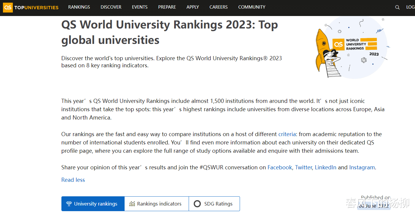 2022年6月8日,位于英国的世界大学排名机构QS发布了2023年世界大学排名,全球共有近1500所大学入选榜单。其中中国共有106所高校入围,包括内地高校71所,香港7所,澳门2所,台湾26所。