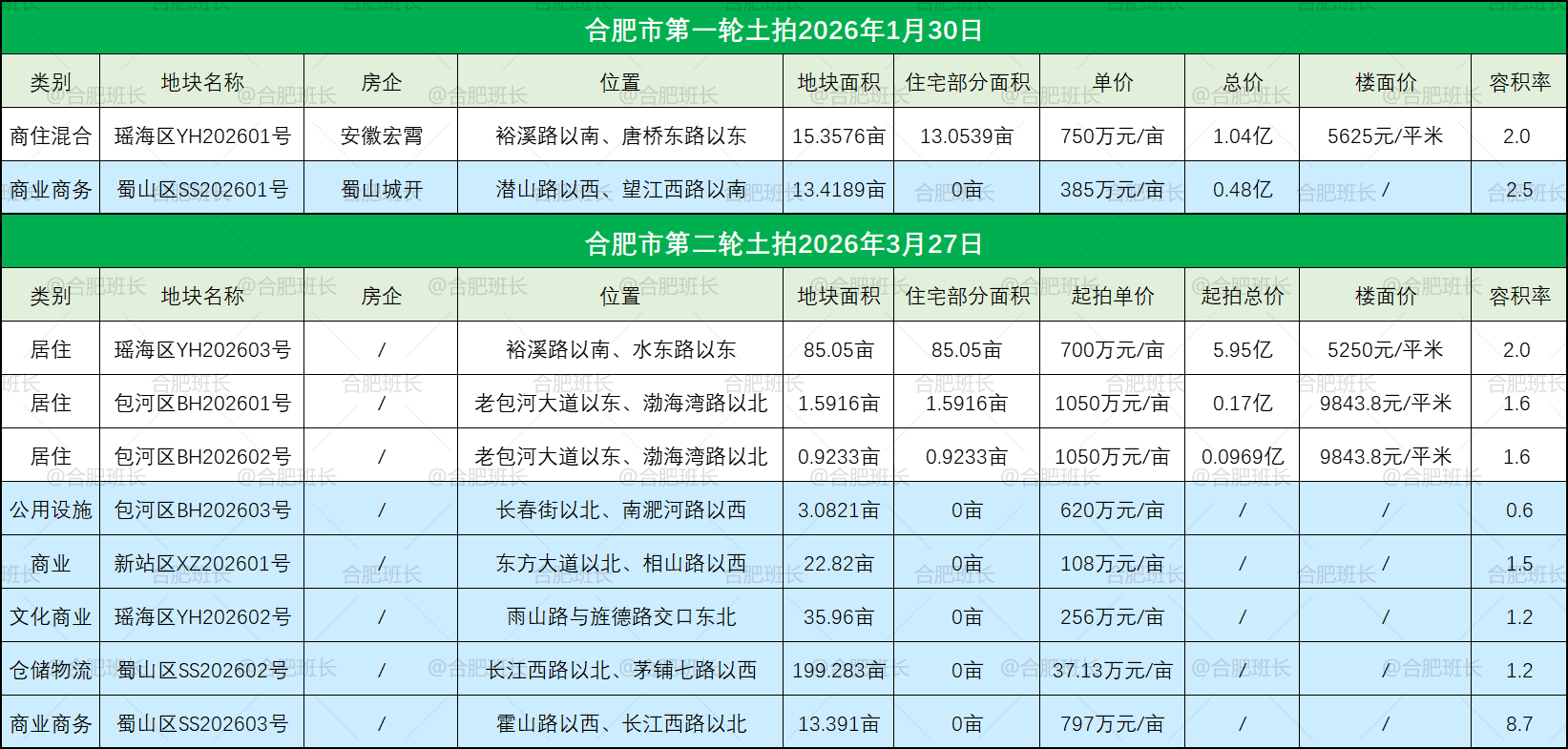 新站区少荃湖中房地块、生态公园城建地块,以及瑶海区大富鸿瑞府、意禾泓庐、城投东新地块、和平片区地块等(其中部分地块可能回购,具体以公告为准)