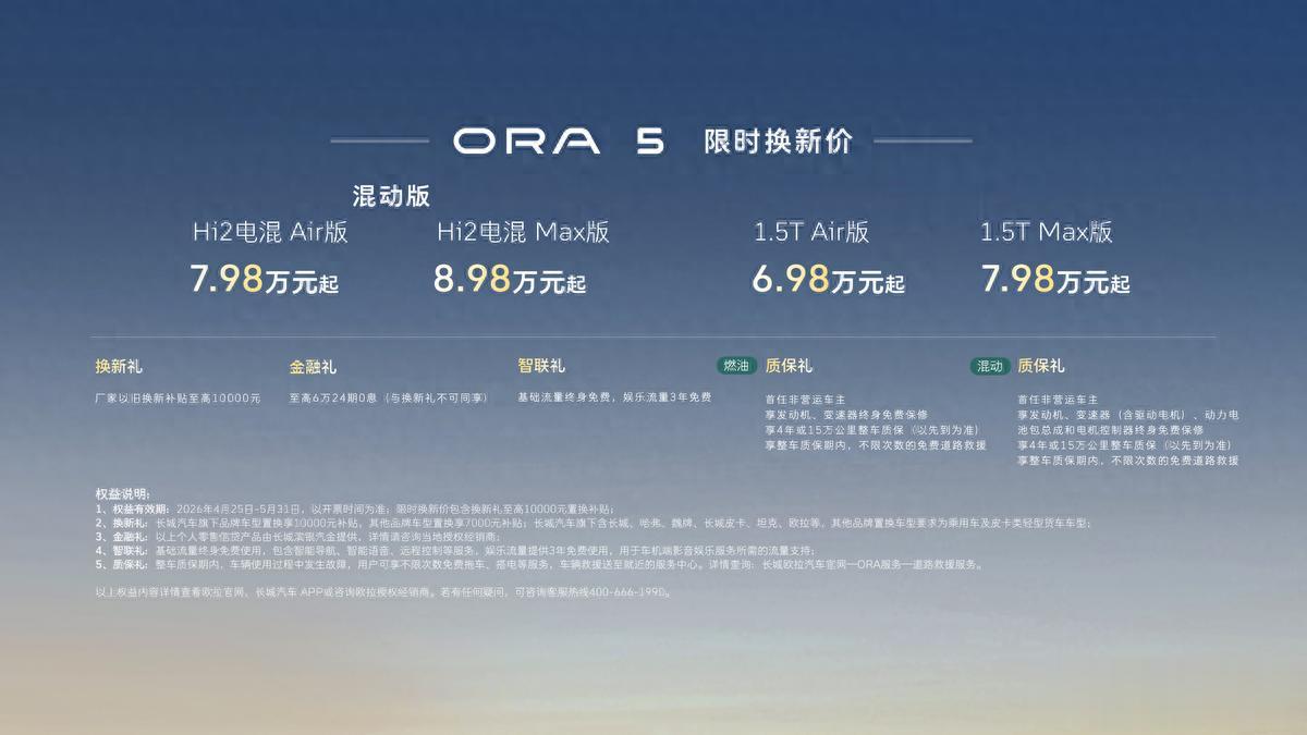 4月25日,长城欧拉在第十九届北京国际汽车展览会举办以“求实”为主题的品牌发布会。长城欧拉5混动版和长城欧拉5燃油版正式上市。其中,欧拉5混动版建议零售价8.98万元起,欧拉5燃油版建议零售价7.98万元起。现在下订更可享包含换新礼、金融礼、智联礼、质保礼在内的四重好礼,叠加上市权益后,欧拉5混动版限时换新价7.98万元起,欧拉5燃油版限时换新价6.98万元起。