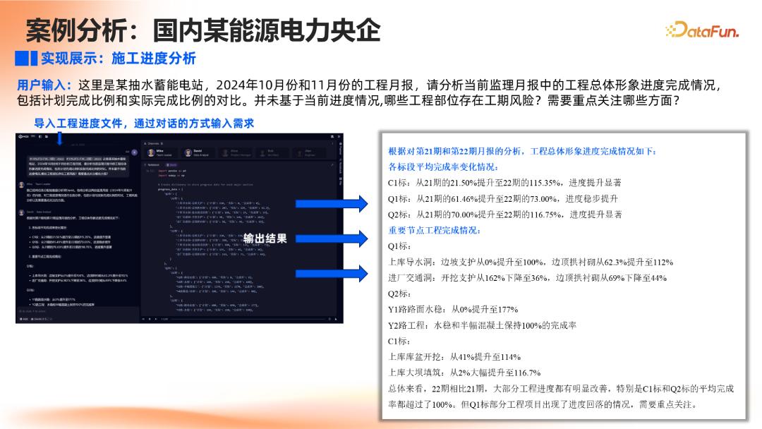 除了数据分析,还包括基于文档的施工进度分析。智能体通过阅读电站月报、文件、会议纪要,进行总体进度总结。总结包括哪里存在工期风险,重点要关注哪里,而且智能体会进一步进行进度分析。