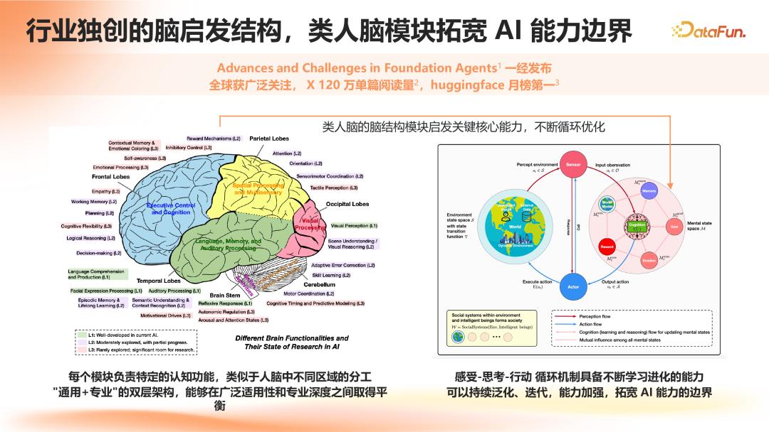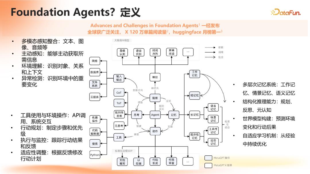 我们在这方面进行了大量研究并发表了多篇论文,来充实 Foundation Agent 的能力,比如在 2025 年 4 月发表了 Advances and Challenges in Foundation Agents 论文。在这篇论文中,定义了 Foundation Agent 工作的模式,技术解析以及对未来如 agent 自身的安全,应用等探讨的探讨。