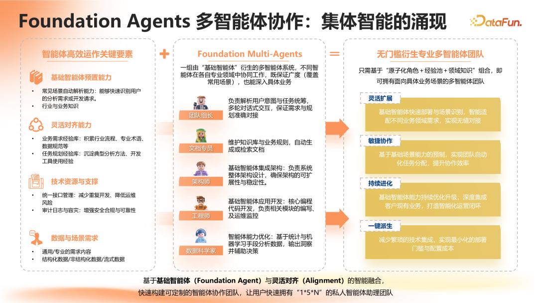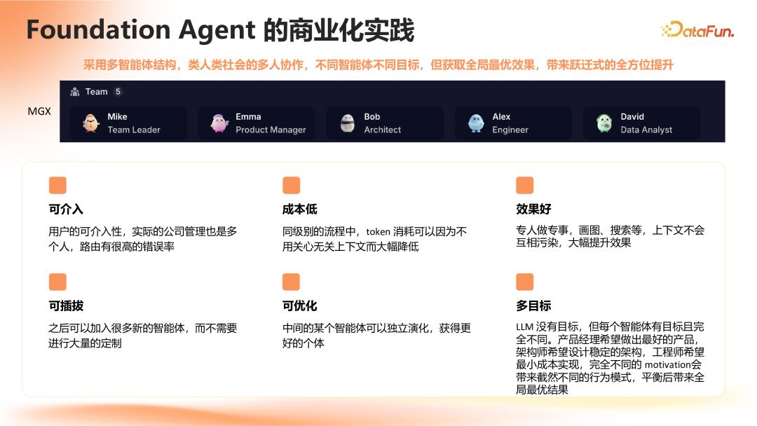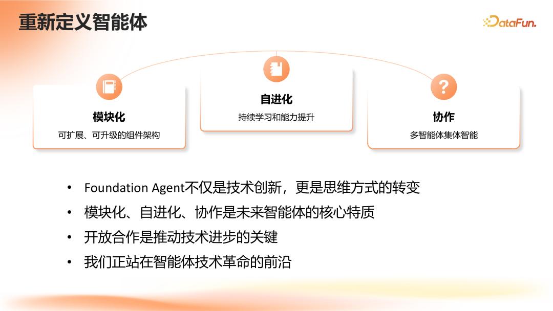 总的来说,对于 Foundation Agent 的创新不在于技术,而是对思维方式的转变,是从 0 到 1 的过程。在过程中,首先对需求的理解和展示,然后展示规划和分析过程,最后展现结果,用户对结果进行验证。抛开传统思维方式,不需要考虑基础的 5 个智能体有什么能力,业务人员可更专注于输入前置条件和内容。另外两个核心特征是模块化的自主进化以及协作能力。