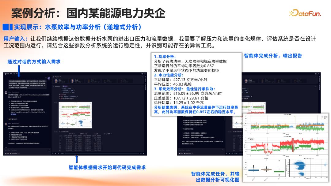 这个场景分析主要分为两部分,数据分析和主体分析。数据分析主要分析数据本身有无缺失值、异常点等,主体分析则是通过数据结合业务进行业务推理,如此例中的功率分析、水力性能分析、系统效率分析。本次输出的整体分析结果是系统在中等流量条件下运行效率最高,这也是业务可以理解和应用的结果。