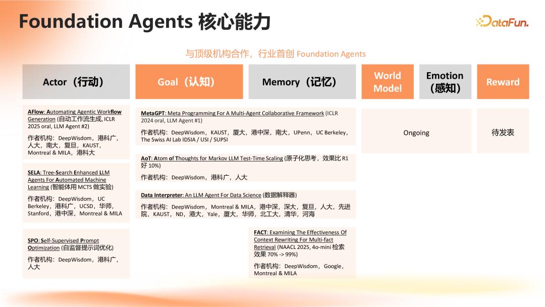 这些论文是对 Foundation Agent 在不同领域、不同技术方向的探索。比如对自动化生成智能体工作流、原子化思考,以及对数据科学处理的开源框架等方向的探索。
